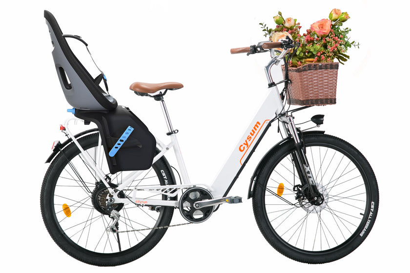 Der Cityrun E-Bike mit 250W Motor und 26-Zoll-Rädern, ausgestattet mit einem praktischen Korb, ist ideal für den täglichen Gebrauch und bietet die Möglichkeit, einen Kindersitz zu installieren.